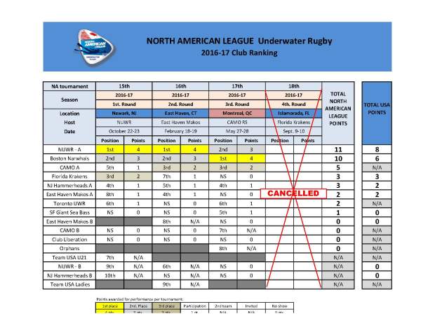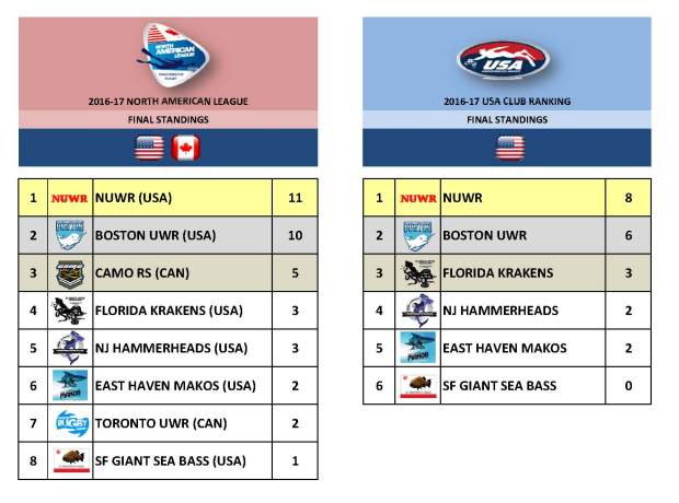 After this round of the 2016-17 NAL Season NUWR leads the standings with 11 points from 2 first places and 1 second place. The Boston Narwhals get closer to NUWR with 10 points in second place. CAMO A is in third place with 5 points followed by the New Jersey Hammerheads and Florida Krakens with 3 points each.